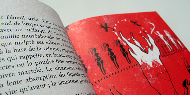 C'est surtout ce va-et-vient entre le texte et l'illustration qui rend l'objet unique, les deux cohabitent, se poussent, se tirent, se tordent, on se promène dans l'histoire et dans les pages, on penche le livre et on louche sur les dessins. Melchior Ascaride illustre ce voyage dans un style fait de silhouettes et de formes en noir, blanc et rouge. Les formes brutes et anguleuses évoquent souvent la pierre, l'os, pour partir ensuite vers des représentations plus symboliques. On a une direction artistique très franche qui rend vraiment bien, c'est assez époustouflant. Elle colle parfaitement à l'ambiance mystique, mythique et spirituelle qui englobe l’œuvre.